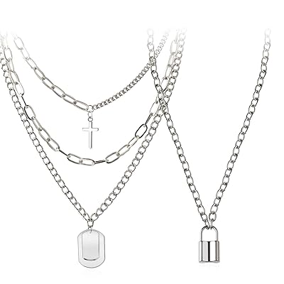 BVROSKI Eboy Chain Necklace - Statement Lock Pendant Necklace Sliver Set Egirl Long Multilayer Rapper Chains Punk Choker 2 Piece for Men Women